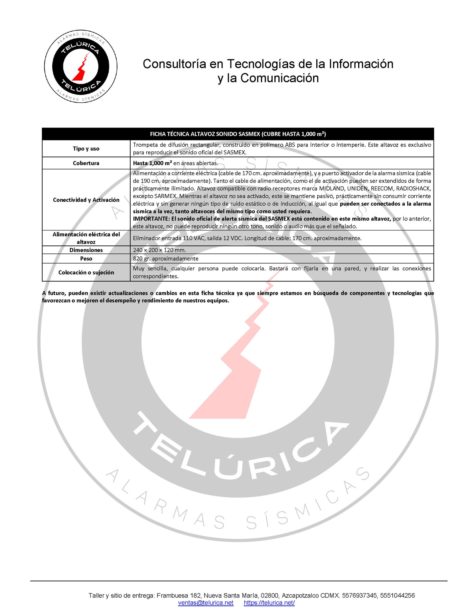 El altavoz incluye y reproduce exclusivamente el tono oficial del SASMEX.